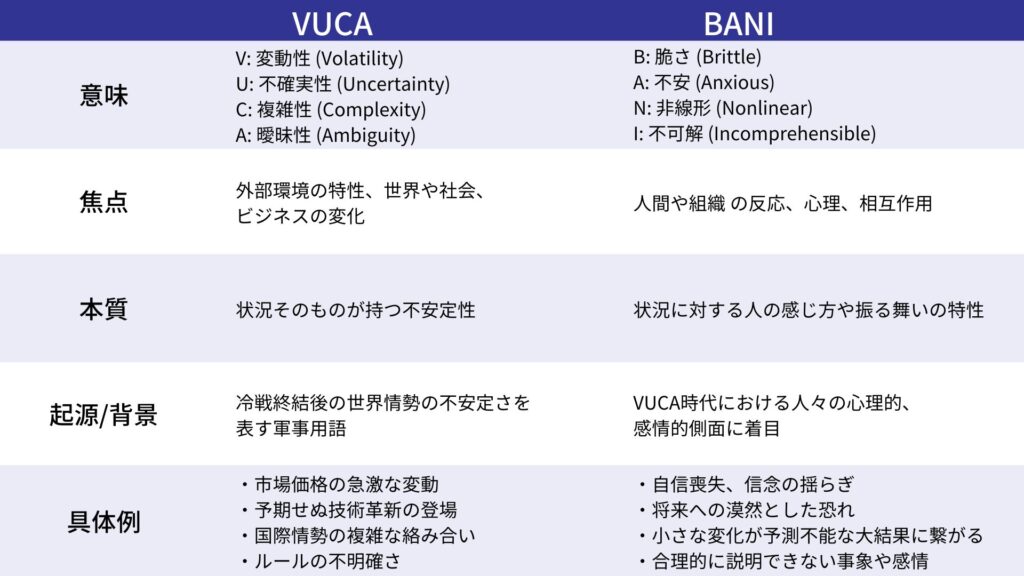 BANIは割と新しい概念で、Brittle(脆さ)、Anxious(不安)、Nonlinear(非線形)、Incomprehensible(不可解)の頭文字から来ています。VUCAのように、主体が自身を取り巻く環境や社会ではなく、我々「人」を主体とした概念です。
